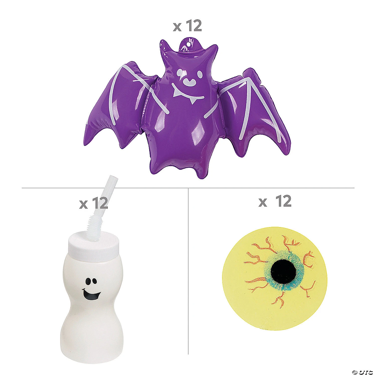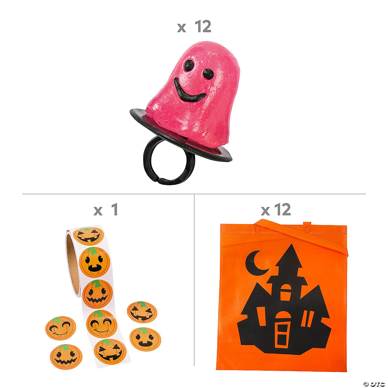 Delight don’t fright Halloween party guests and trick-or-treaters with these too-cute-to-spook party favor bags! Complete with everything you need to pack them full of a variety of candy-alternative Halloween treats, kids are sure to go batty for these goody bags! (84 pcs. per unit) Simple assembly required. Assortment may vary.Includes:• 12 Nonwoven polypropylene Large Iconic Halloween Tote Bags (15″ x 17″ with 10″ handles.)• 1 Jack-O’-Lantern Face Sticker Roll (Includes 100 stickers per roll, shrink-wrapped. 1 1/2″)• 12 Plastic Ghost Cups with Lids & Straws (Includes a flexible straw for easy drinking at any angle. 5″ x 2 1/2″ 8 oz.)• 12 Vinyl Inflatable Halloween Bats (Inflated, 7″ x 4″.)• 12 Rubber Glow-in-the-Dark Eyeballs Bouncy Balls (1 1/4″; 35mm; Expose item to direct light to activate glow.)• 12 Neon Ghost Ring Lollipops (Blue raspberry, green apple and strawberry flavors. 1 1/4″ sucker on a 1/2″ plastic ring. Individually wrapped. Total wt., 5 oz. For more information, visit our “Return Policy” page located on our website. Ingredient, nutrition, allergen and other product information are provided on our Web and Mobile sites for reference purpose only, without warranty or representation as to accuracy. Manufacturers adjust their labeling regularly and are solely responsible for the accuracy of the information. For general questions concerning these items, please contact our customer service at 800-875-8494.)• Assortments are subject to change at any time and may vary from picture shown. Substituted items will be similar in nature.