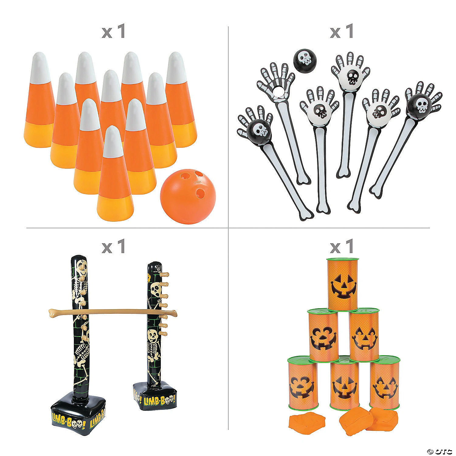 Entertain Halloween party guests with this fun kit that’s full of not-so-spooky party games. Ring toss, relay games and more are included in this fun kit that makes Halloween fun easy! Great for Halloween parties at home or in the classroom, these games are also great for trick-or-treaters who can compete for extra treats! (4 pcs. per unit) Assortment may vary. Includes: • 1 Vinyl Inflatable Halloween Limbo Kit (Includes two 5-ft. poles on 16″ bases that can be filled with water for added stability. Includes a 5-ft. bone-shaped limbo stick.)• 1 Wooden Halloween Skeleton Relay Game (1 1/4″ x 10 1/2″ with six 2″ plastic balls.)• 1 Plastic Fall Bowling Set (Includes 10 pins, 8 1/2″; and 1 ball, 4″.)• 1 Plastic Jack-O’-Lantern Can Bean Bag Toss Game (Includes 6 plastic 5″ x 3″ diam. cans and 3 canvas 2 1/2″ bean bags.)• Assortments are subject to change at any time and may vary from picture shown. Substituted items will be similar in nature.