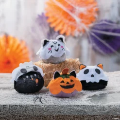 These festive plush cats are all wearing a ghost costume! Super cute Halloween toys, add these small stuffed animals to candy-alternative treats for trick-or-treaters or to add to Halloween favor bags and classroom prize bins during the Halloween season. Plush. 3 1/4″