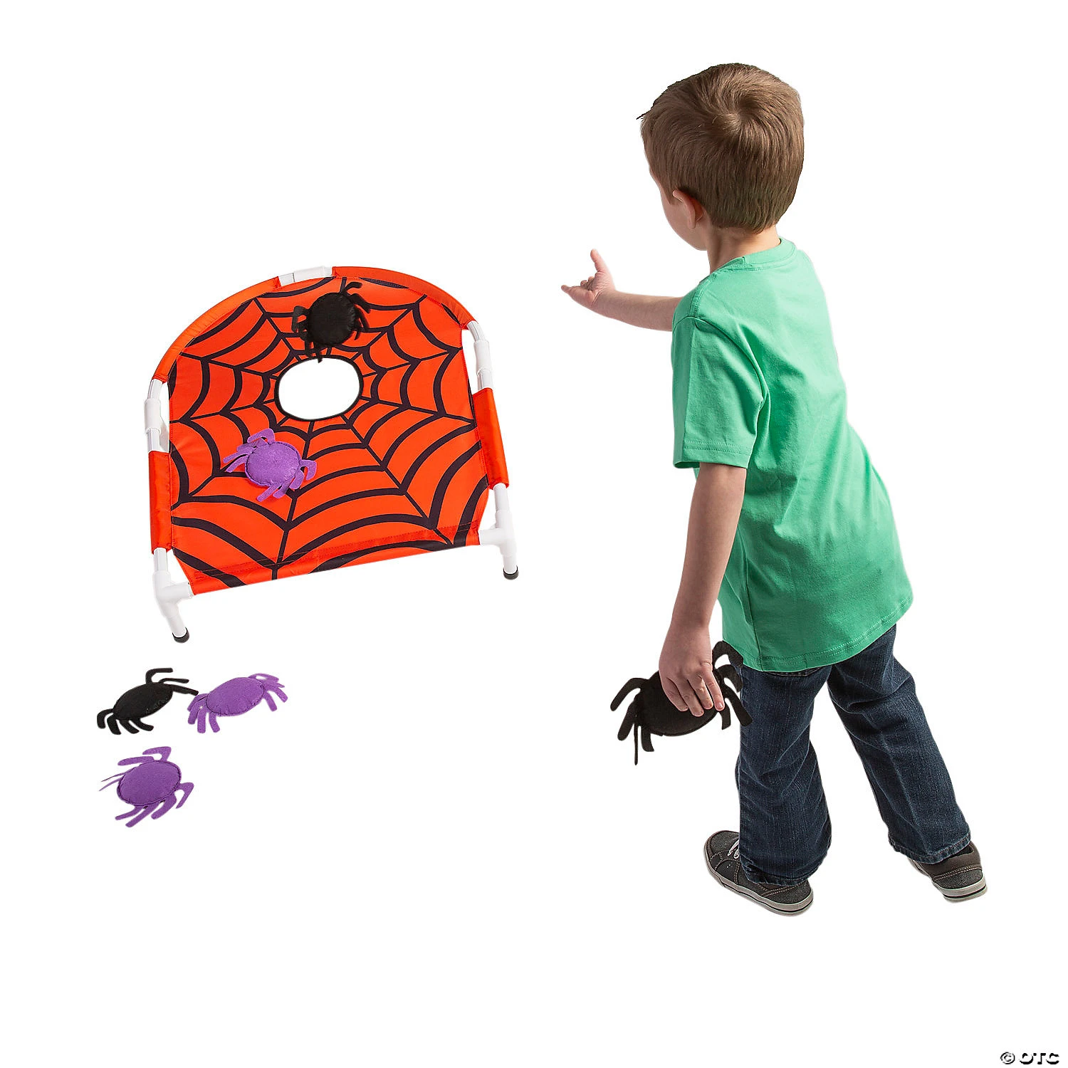 Family Halloween fun is easy with this fun cornhole game. Featuring a Halloween spider web design and spider-shaped bean bags, this not-so-spooky Halloween game is fun for all ages! Play in teams or one player versus another – the one with the most bean bags landed in the hole is the winner. Plastic and polyester. (7 pcs. per set) Includes 24 3/4″ x 29″ game board and three 4″ x 4″ purple bean bags and three 4″ x 4″ black bean bags. Simple assembly required.